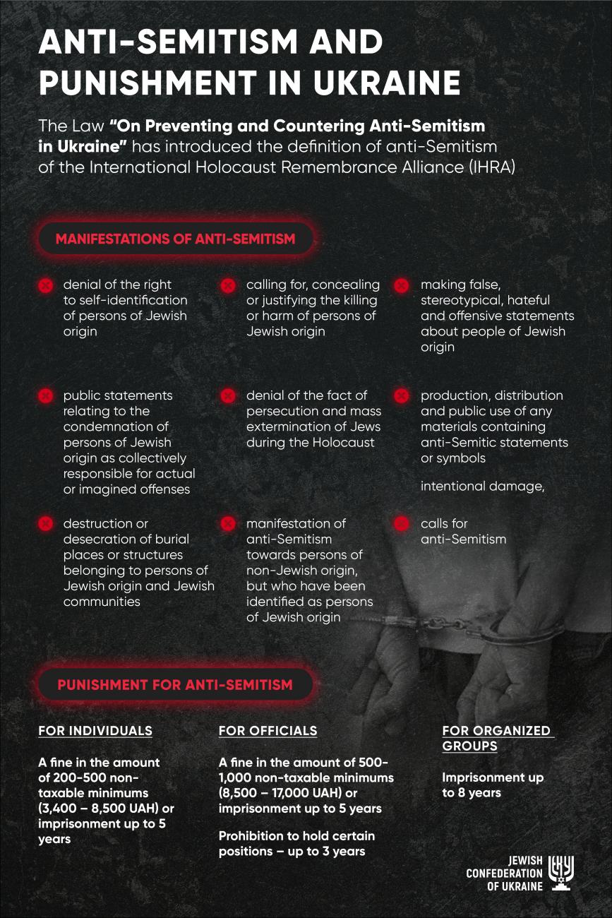 Together with the Ministry of Internal Affairs, JCU has been conducting joint monitoring of manifestations of anti-Semitism for a long time, and the Ministry of Internal Affairs promptly responds to all cases of physical or online anti-Semitism. However, for an effective fight against these manifestations, the legal component was missing.