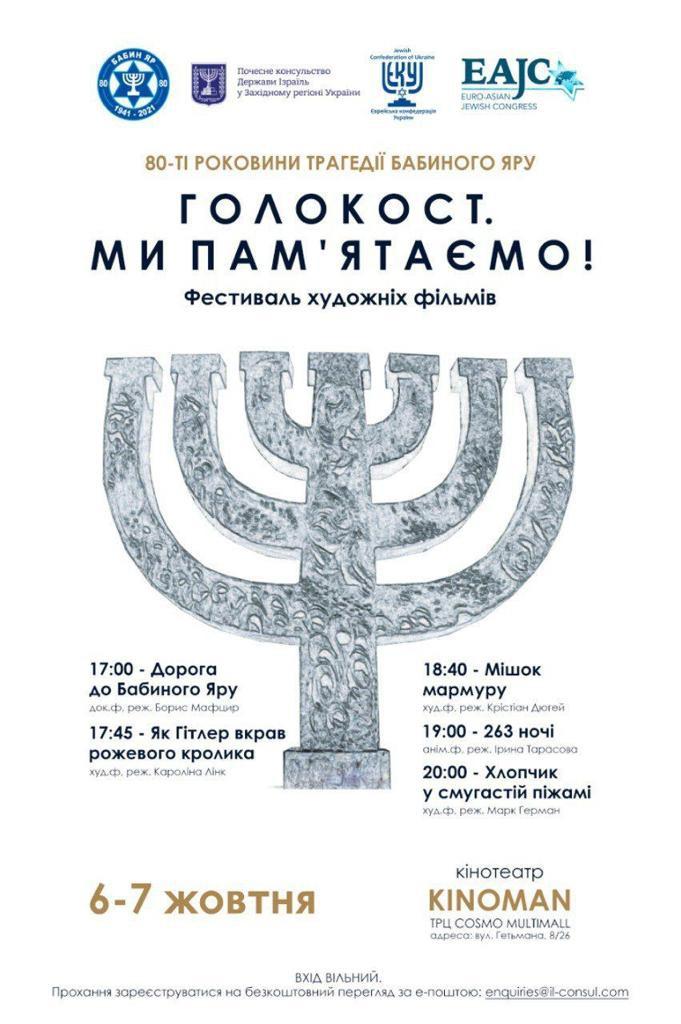 Протягом 6-7 жовтня, у Києві, в кінотеатрі «KINOMAN», ТРЦ «COSMO MULTIMALL» (адреса: вул. Вадима Гетьмана, 8/26), будуть показані фільми, присвячені темі пам’яті геноциду євреїв у часи Другої світової війни.