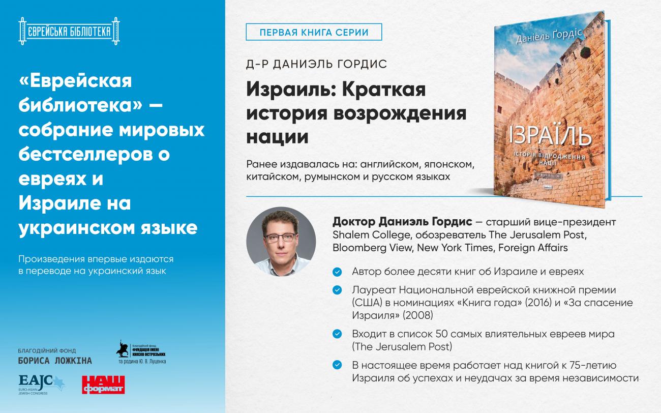 Першою книгою, виданою в «Єврейській бібліотеці», стала робота доктора Даніеля Гордіса «Ізраїль: Історія відродження нації». 2016 року вона стала переможцем найпрестижнішої премії в області літератури про євреїв, заснованої в США у 1944 році, - Національної єврейської книжкової премії. «Ізраїль: Історія відродження нації» вже була опублікована англійською, японською, китайською, румунською та російською мовами. У видавництві «Наш Формат» український переклад книги Даніеля Гордіса вийшов вперше.