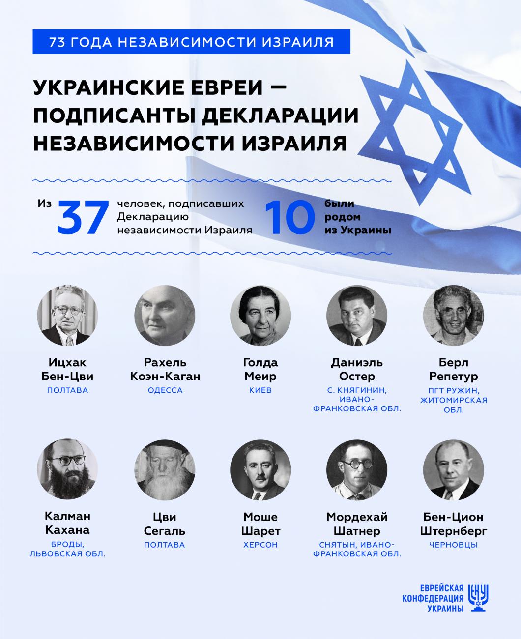 Среди пионеров-основателей, о которых идет речь в Декларации, было немало и евреев - выходцев с территории современной Украины. Да и сама Декларация была подписана в бывшем доме первого мэра Тель-Авива, Меира Дизенгофа, значительная часть жизни которого была связана с Украиной, написал в Facebook президент Еврейской конфедерации Украины Борис Ложкин.